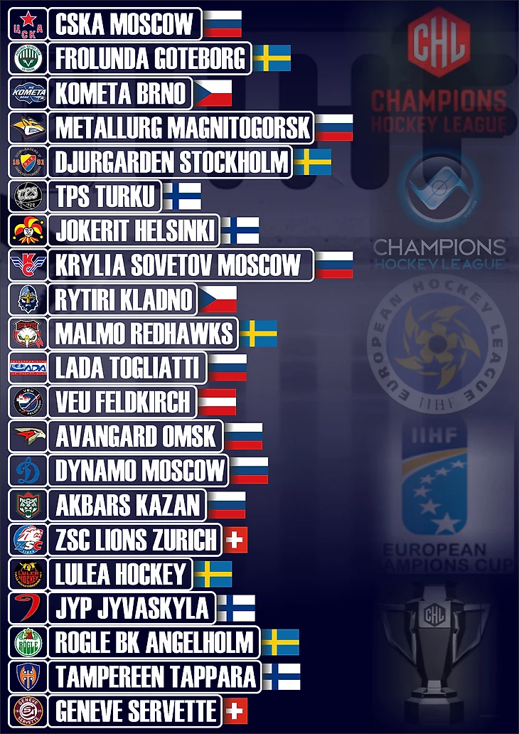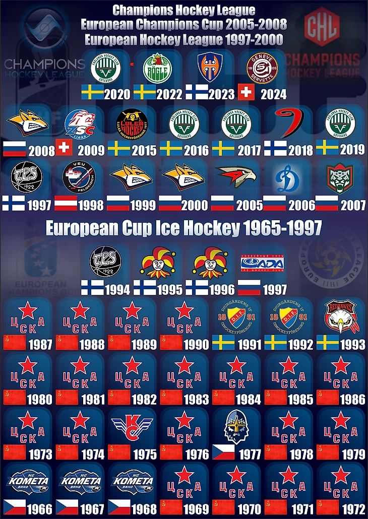 Первым и самым продолжительным клубным европейским турниром был Кубок Европы по хоккею с шайбой, который проводился с 1966 по 1997 год. Иногда в нём использовался формат плей-офф, иногда групповой формат, а в некоторые годы комбинация обоих форматов. Сезон 1996/1997 стал первым для Европейской хоккейной лиги, нового клубного соревнования, похожего на Лигу чемпионов УЕФА в футболе. Лига просуществовала 4 года и была выиграна тремя разными клубами. С 2005 года разыгрывался Европейский кубок чемпионов. Все турниры проходили в Ледовом дворце города Санкт-Петербург и их выиграли чемпионы России. Хоккейная Лига Чемпионов – турнир, единственный розыгрыш которого состоялся в 2008 -2009 годах. В сезоне 2014/2015 стартовал другой турнир с таким-же названием. В этом соревновании участвуют команды из высших хоккейных лиг как минимум шести европейских стран.