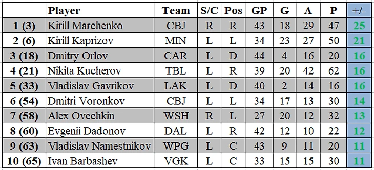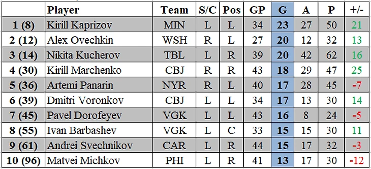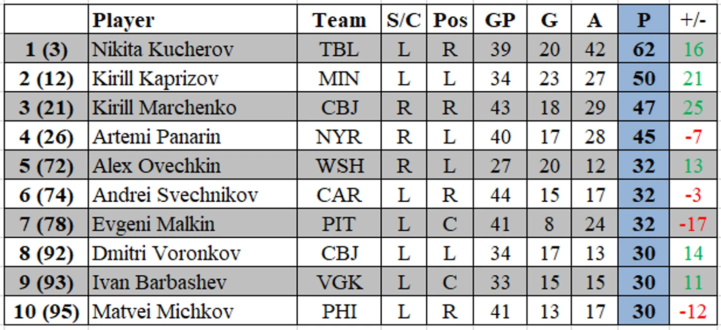 Тройка наших лучших бомбардиров не изменилась с прошлой недели: 1) Никита Кучеров с 62 (20+42) очками в 39 матчах, 2) Кирилл Капризов 50 (23+27) очков в 34 матчах и 3) Кирилл Марченко 47 (18+29) очков в 43 матчах.