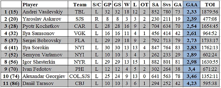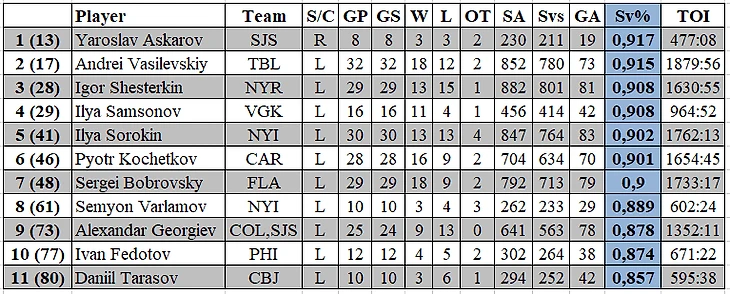 По проценту отраженных бросков среди наших вратарей пока лучшим остается Ярослав Аскаров, который после 8 матчей в составе «Сан-Хосе» имеет 91.7 % отраженных бросков (при 3 победах).