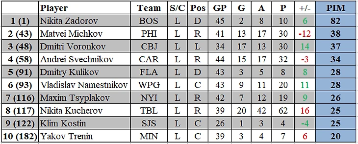 Тройка наших игроков по штрафному времени выглядит следующим образом: Задоров, Матвей Мичков (38) и Дмитрий Воронков (37).