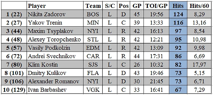 По количеству силовых приемов лидером среди наших является Никита Задоров, который сделал уже 124 хита за 45 матчей. Тройка лидеров по абсолютным показателям выглядит следующим образом: 1) Никита Задоров; 2) Яков Тренин 116 хитов в 39 матчах; 3) Максим Цыплаков 97 хитов в 42 матчах.