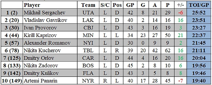 В топ-10 по игровому времени располагается 3 форварда – Кирилл Капризов, Никита Кучеров и Артемий Панарин.