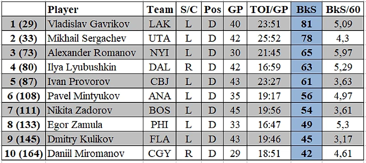 Единоличным лидером по заблокированным броскам среди наших игроков является Владислав Гавриков, у которого уже 81 блок за 40 матчей. Вторую строчку занимает Михаил Сергачев с 78 блоками в 42 матчах. На третьем месте расположился Александр Романов с 65 заблокированными бросками в 30 матчах. Стоит отметить, что у Романова сыграно значительно меньше матчей, чем у Гаврикова и Сергачева. Если бы не травмы, Александр скорее всего лидировал бы по блокам среди наших игроков.