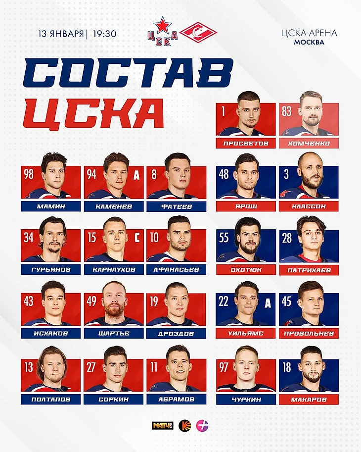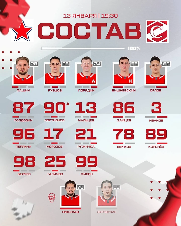 🥅 Николаев в воротах ▲ Перлини ▲ Иванов ▽ Усманов ▽ Ефремов Иванов не играл с 19 декабря, как раз с матча против ЦСКА. Рубцов с Пашиным — в первом звене (с Порядиным); Морозов с Ружичкой — в третьем (с Перлини).