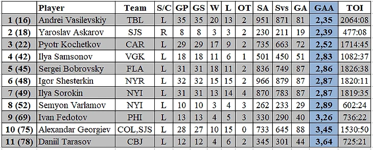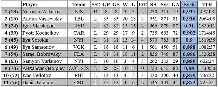 По проценту отраженных бросков среди наших вратарей пока лучшим остается Ярослав Аскаров, который после 8 матчей в составе «Сан-Хосе» имеет 91.7 % отраженных бросков (при 3 победах).