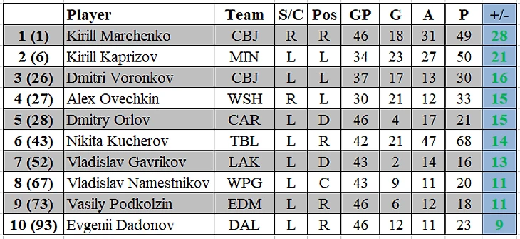В топ-50 всей лиги располагается 4 российских форварда.