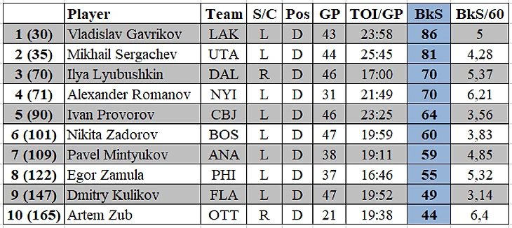 Пятерка лучших во всей лиге выглядит следующим образом: 1) Джейкоб Троуба («Рейнджерс», «Анахайм») 131 заблокированный бросок в 45 матчах; 2) Иэн Коул («Юта») 130/45; 3) Крис Танев («Торонто») 125/46; 4) Колтон Парайко («Сент-Луис Блюз») 112/47; 5) Расмус Андерссон («Калгари») 111/45.
