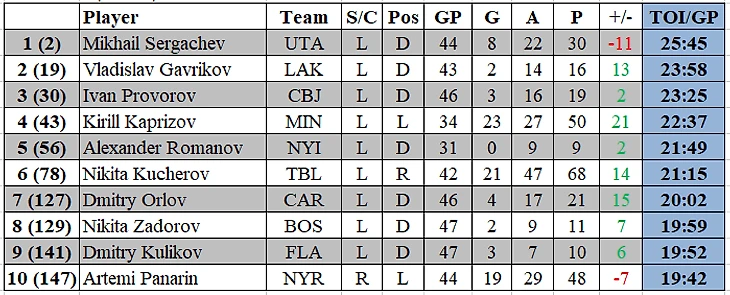 Среди форвардов Кирилл Капризов (22:37) по среднему игровому времени уступает лишь лидеру «Колорадо» Нэйтану Маккинону (23:06). Никита Кучеров входит в десятку лучших по игровому времени среди форвардов всей НХЛ.