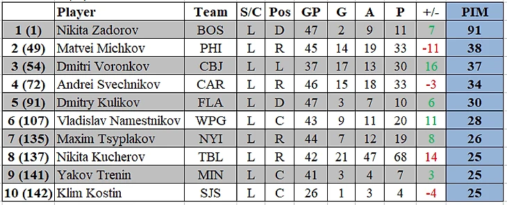 Тройка наших игроков по штрафному времени выглядит следующим образом: Задоров, Матвей Мичков (38) и Дмитрий Воронков (37).
