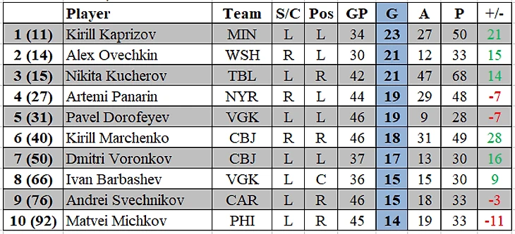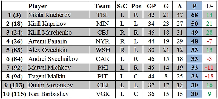 Тройка наших лучших бомбардиров не изменилась с прошлой недели: 1) Никита Кучеров с 68 (21+47) очками в 42 матчах, 2) Кирилл Капризов 50 (23+27) очков в 34 матчах и 3) Кирилл Марченко 49 (18+31) очков в 46 матчах.