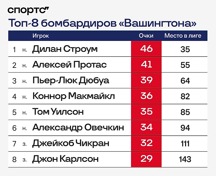 У «Вашингтона» нет игрока в топ-30 бомбардиров