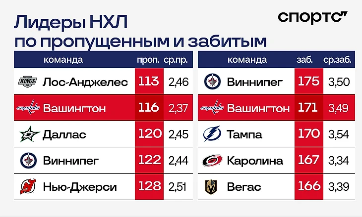 Меньше «Кэпиталс» в этой регулярке пропускают только «Кингс». Лидерство по забитым держится на дополнительных показателях, но тут важен сам факт: назовите любого атакующего монстра лиги («Тампа», «Колорадо», «Виннипег») – «Вашингтон» рядом с ним.