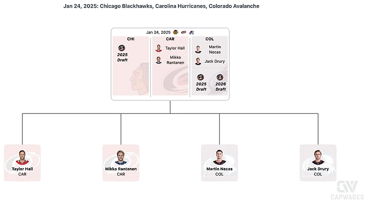Всё в этой истории кажется логичным, хоть и не достаточным за такие услуги, но... Вопрос компенсации за высвобожденные 1,375 млн $ – а это пик третьего раунда драфта 2025 года, с которым всё не так просто. Этот пик отдала «Каролина», но получила она его от… «Чикаго». 24 июня 2024 года команды обменялись выборами на драфтах: пик 3 раунда 2024 года поехал в Чикаго, а такой же пик 2025 года направился в Роли.
