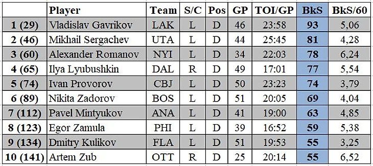 Пятерка лучших во всей лиге выглядит следующим образом: 1) Джейкоб Троуба («Рейнджерс», «Анахайм») 137 заблокированных бросков в 48 матчах; 2) Иэн Коул («Юта») 135 в 49; 3) Крис Танев («Торонто») 132 в 49; 4) Колтон Парайко («Сент-Луис Блюз») 120 в 50; 5) Радко Гудас («Анахайм») 115 в 49.