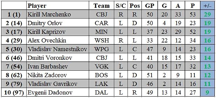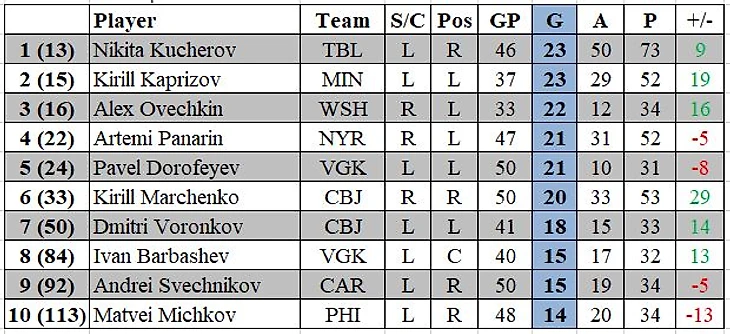 В топ-50 всей лиги располагается 4 российских форварда (Кучеров, Марченко, Капризов, Панарин).