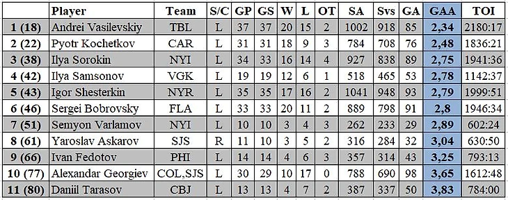 По коэффициенту надежности первое место среди наших вратарей также занимает Андрей Василевский с 2.34. Вторым идет Петр Кочетков с 2.48, третье место занимает Илья Сорокин с 2.75.