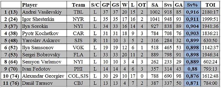 По проценту отраженных бросков на первое место снова вышел Андрей Василевский, который имеет 91.6 % в 37 матчах.