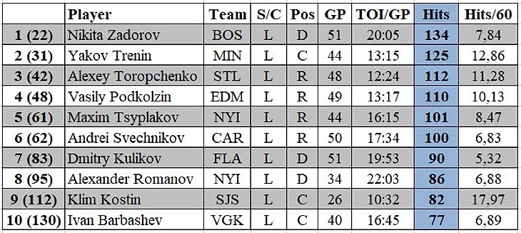 По количеству силовых приемов на 60 минут пятерка лидеров среди россиян выглядит следующим образом (среди игроков, сыгравших более 10 матчей): 1) Клим Костин 17.97 (82 силовых приема в 26 матчах); 2) Яков Тренин 12.86 (125 в 44); 3) Алексей Торопченко 11.28 (112 в 48); 4) Василий Подколзин 10.13 (110 в 49); 5) Иван Мирошниченко 9.99 (28 в 18).