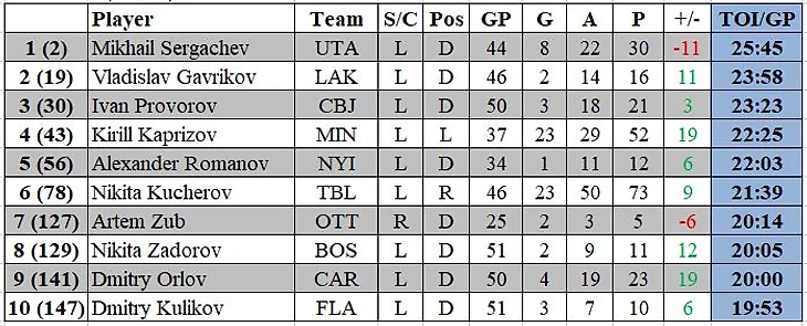 Лидером по игровому времени среди наших игроков остается Михаил Сергачев. В общем списке НХЛ он идет вторым уступая лишь Заку Веренски («Коламбус», 26:47). Третьим по игровому времени идет защитник «Колорадо» Кейл Макар (25:42). Игровое время Сергачева за последнюю неделю не изменилось, так как он сейчас в списке травмированных и уже пропустил 5 матчей «Юты» подряд.