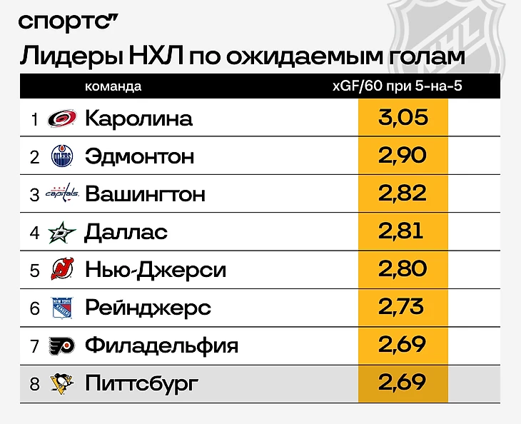 Например, «Питтсбург» здорово идет по ожидаемым голам при 5-на-5: в этом сезоне долго находился в топ-5, а сейчас восьмой – выше «Вегаса», «Тампы» и «Виннипега».