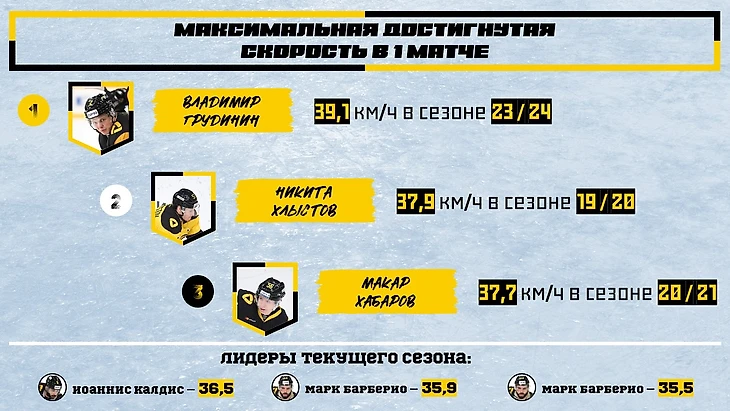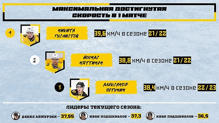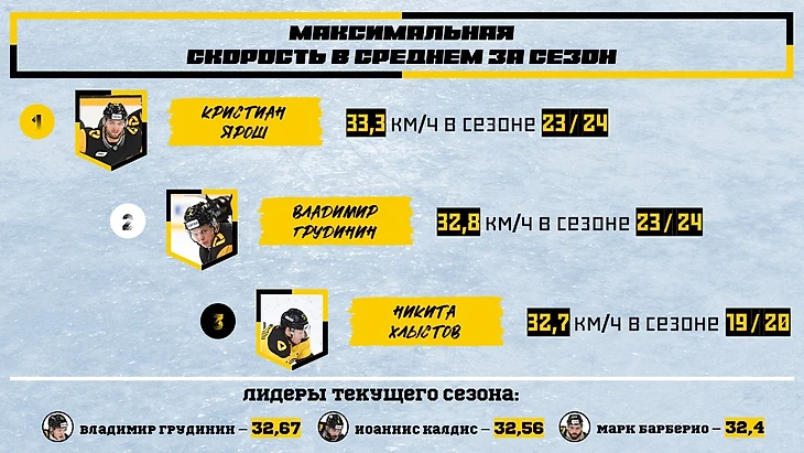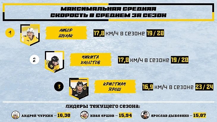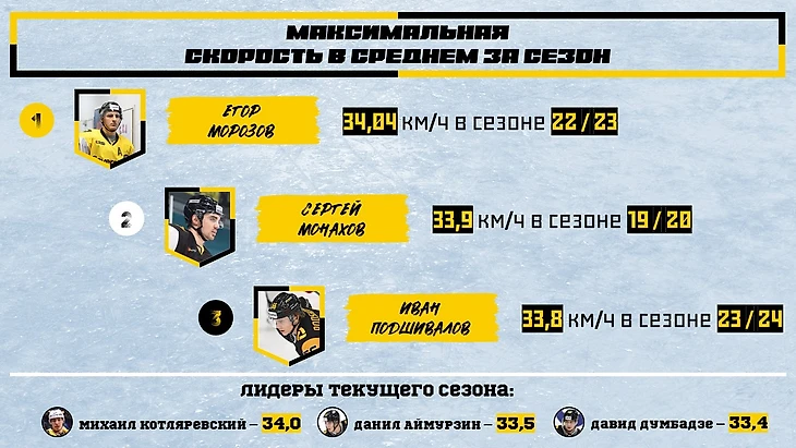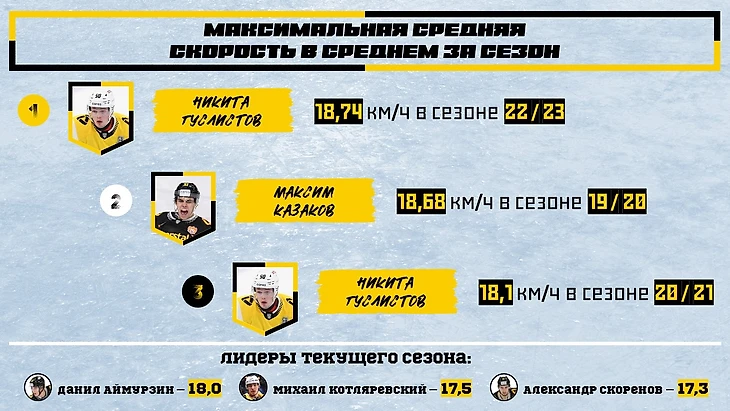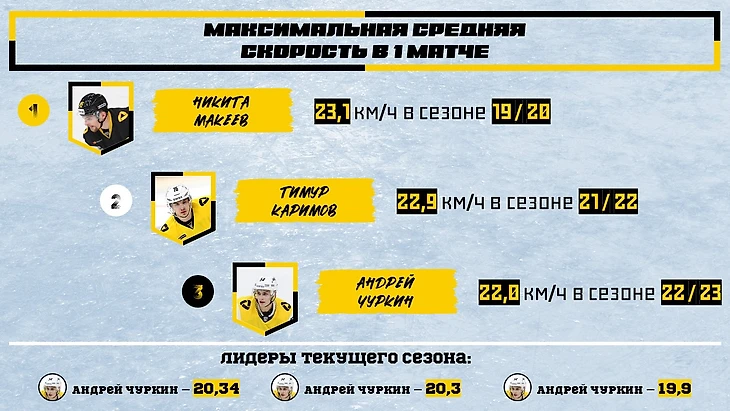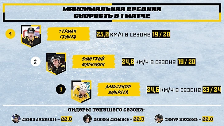 Средняя скорость в течение 1 матча. Вся тройка лидеров максимально непредсказуемая, многие вообще таких игроков не вспомнят, но статистика зафиксирована и рекордсменом уже несколько лет является Герман Грачев со скоростью 25 км/ч. Как и защитники, нападающие этого сезона сильно отстают от тройки.