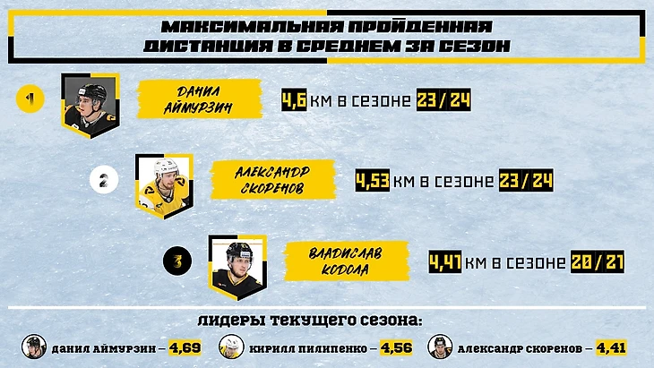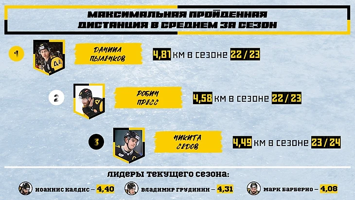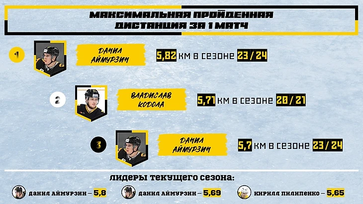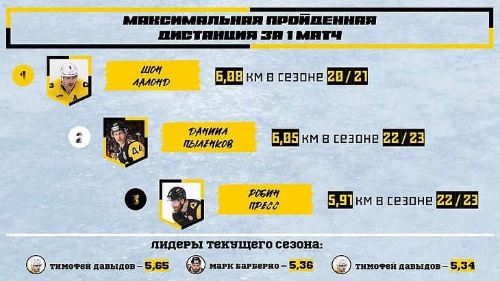Максимальная пройденная дистанция за матч. К сожалению, в доступной статистике у игроков нельзя выделить (и убрать для чистоты сравнения) дистанцию, пройденную за овертайм. Она фиксируется одной цифрой за целый матч. Поэтому, как правило, в лидерах по пройденной дистанции результаты, достигнутые в матчах с полным овертаймом. Так, на 1 месте оказался Шон Лалонд с результатом 6,08 км за матч (игра с Йокеритом, дошедшая до буллитов), на втором Данил Пыленков (6,05) в игре со Спартаком, завершившейся в самом конце овертайма, а на третьем – Пресс из матча ХК Сочи, также выигранной по буллитам. В этом сезоне команда двигается много, но результаты достигаются в большей степени за счет нападающих (это будет видно ниже в статье), защитники же не очень-то близки к рекордам.