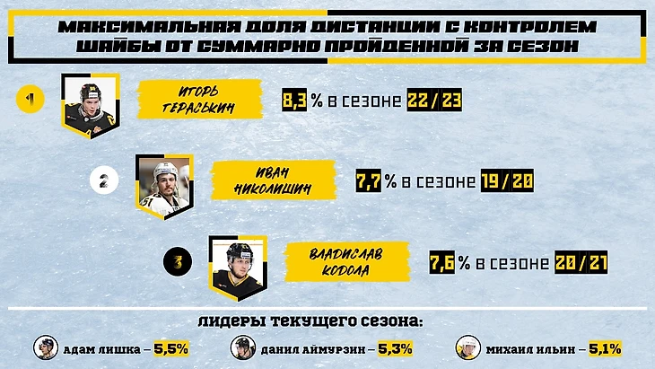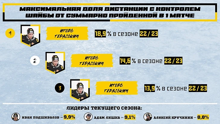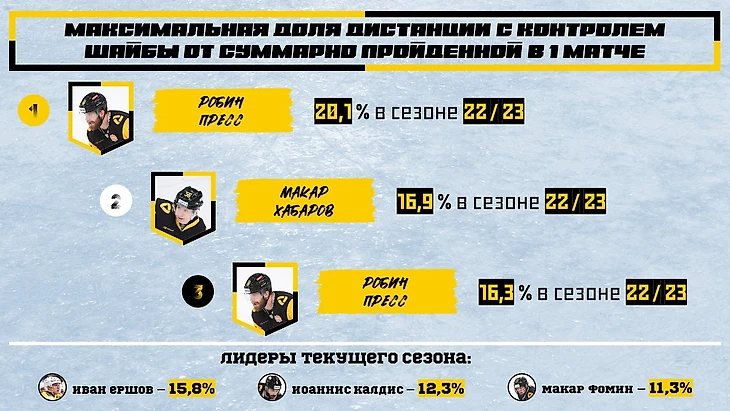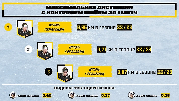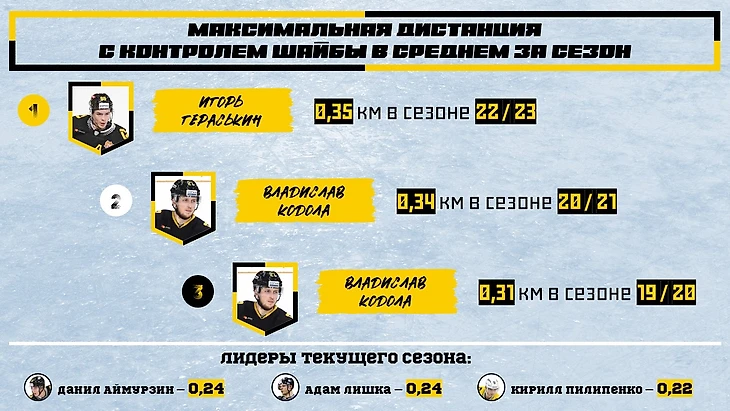 В дистанции с шайбой за матч опять же преимущество у игроков команд Разина. Гераськин единолично занял весь пьедестал, при этом его рекорд существенно превышает все другие результаты – почти километр за игру. В текущей команде роль Игоря досталась Лишке – он никого не подпускает к лидерству в этом сезоне, хотя до рекордов ему далеко.