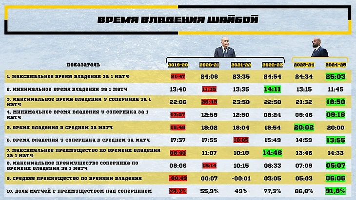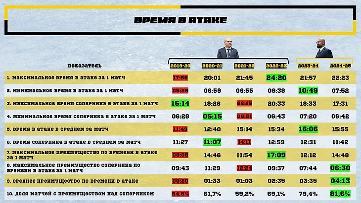 Несмотря на то, что рекордные разовые значения в основном принадлежат Разину, именно средние или абсолютные забрал себе Козырев (всего распределение 5 на 5), причем, иногда с хорошим отрывом: среднее время в атаке лучше (пусть и незначительно), но наиболее примечательны 9-й и 10-й показатели: «среднее преимущество по времени в атаке» и «доля матчей с преимуществом над соперником». В них у Козырева приличный отрыв, и по цифрам видно, что эта команда редко дает соперникам вести игру, атакует больше. Средняя разница между ВВА Северстали и ВВА соперника в этом сезоне превысила 4 минуты за матч – это очень значительное преимущество (некоторые команды в среднем проводят менее 10 минут в атаке).
