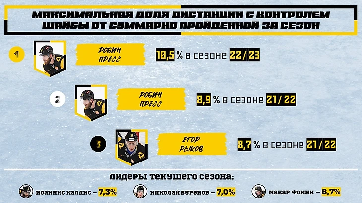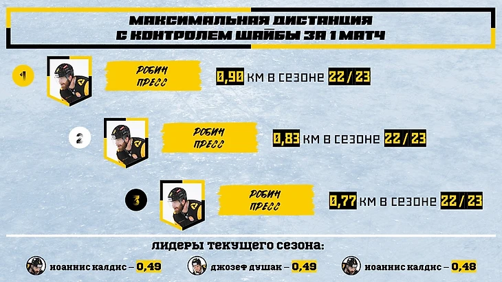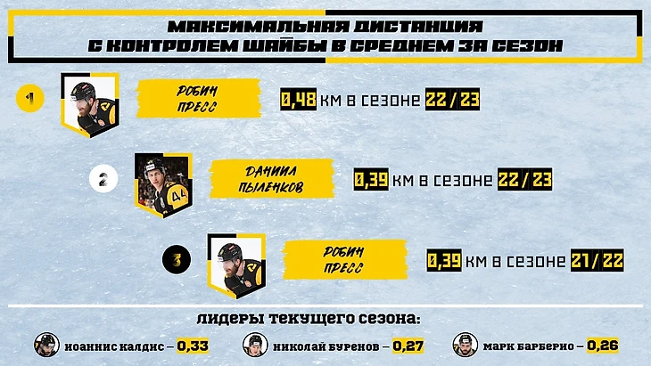 В среднем за сезон по аналогичному показателю лидер, как и ожидалось – Робин Пресс (он же на 3 месте) – почти полкилометра с шайбой за матч. И опять же, ожидаемо, что в этом году даже в тройку никто не войдет.