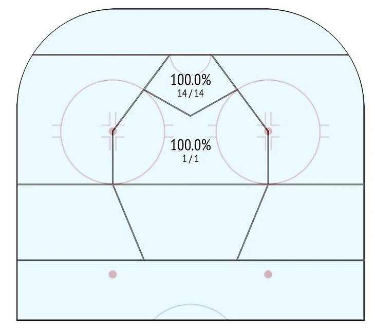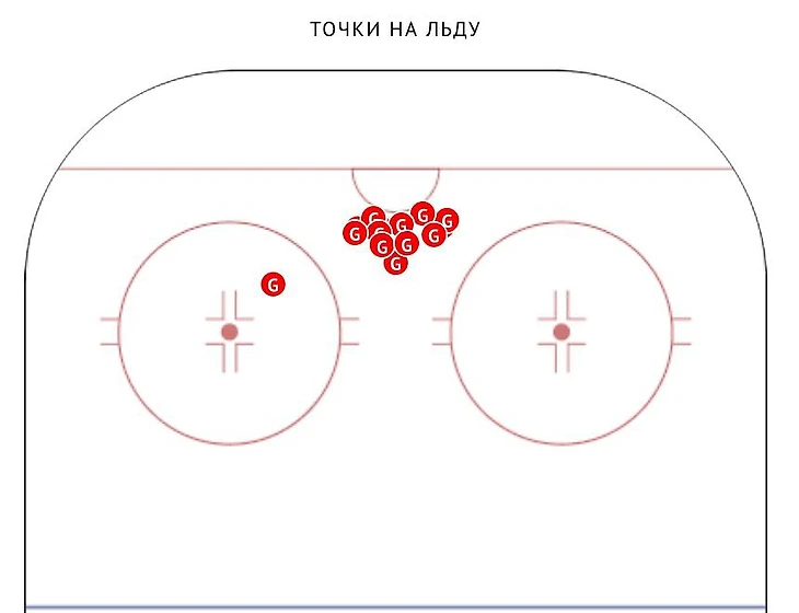 Главный снайпер команды хорошо действует под воротами, что подтверждается картой его голов. В середине декабря, когда у Егора уже было 15 шайб, 14 он забросил с пятака. Лишь один гол Егор забил с дистанции – из круга вбрасывания.