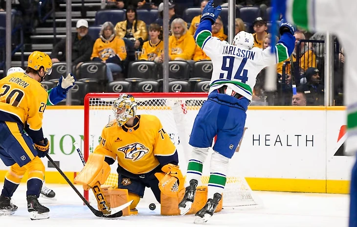 Последняя в чемпионате игра с «Нэшвиллом» прошла на выезде. Последний раз «Ванкувер» был тут весной в плей-офф. Кстати, в серии «Кэнакс» выиграли в Теннеси все три встречи (дома было 1-2), а до того и дважды в регулярке. В этом сезоне обе домашние игры «Ванкувер» уступил, зато в гостях снова оказался сильнее. Хьюз, конечно, поучаствовал в обеих шайбах, а еще отметим классный матч (наконец-то) Тэтчера Демко (в двух предыдущих победных играл Кевин Ланкинен). Ну и суперпас Майерса на первый в карьере гол Линуса Карлссона – конфета. Для дебютной шайбы 25-летнему шведу потребовалось десять встреч в НХЛ (в прошлом и нынешнем сезонах).