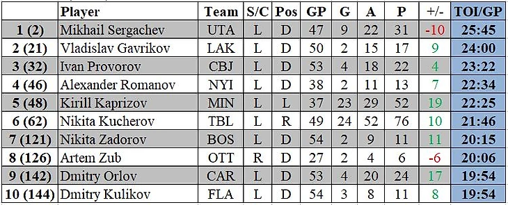 Лидером по игровому времени среди наших игроков остается Михаил Сергачев (25:45), который занимает первую строчку с первого матча. В общем списке НХЛ он идет 2 уступая лишь Заку Веренски («Коламбус», 26:48). Третьим по игровому времени идет защитник «Колорадо» Кейл Макар (25:39).