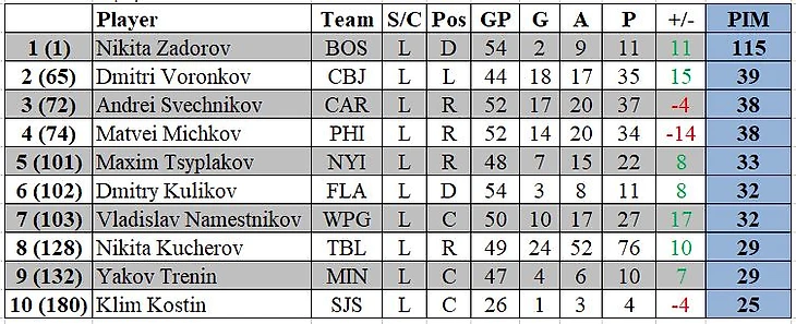 Тройка наших игроков по штрафному времени выглядит следующим образом: Задоров, Дмитрий Воронков (39), третье место делят Андрей Свечников и Матвей Мичков у них по 38 минут штрафа.