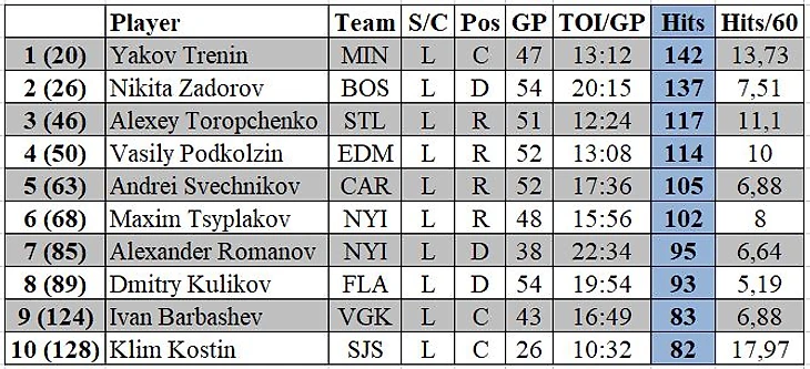 На втором месте располагается Никита Задоров (137 силовых в 54 матчах); третьим идет Алексей Торопченко (117 хитов в 51 матче).