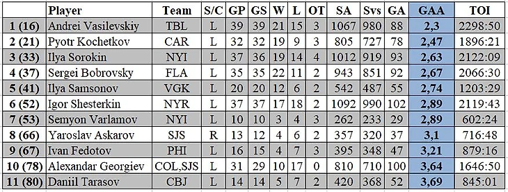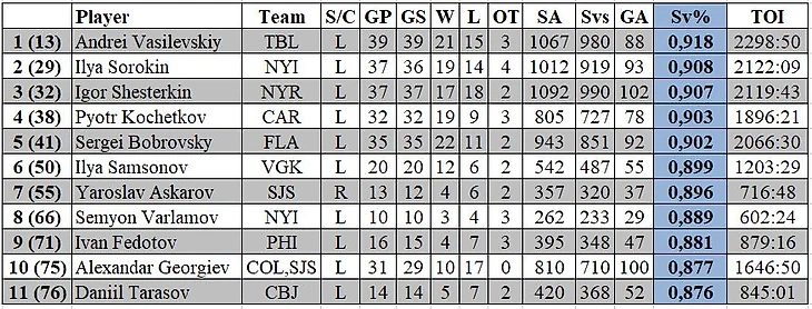 По коэффициенту надежности первое место среди наших вратарей также занимает Андрей Василевский с 2.30. Вторым идет Петр Кочетков с 2.47, третье место занимает Илья Сорокин с 2.63.