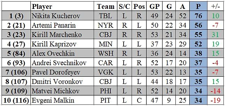 Никита Кучеров уверенно лидирует среди наших по набранным очкам, у Кучерова 76 (24+52) очков в 46 матчах. В борьбе за Арт Росс Трофи он пока уступает лишь 2 форвардам: 1) Нэйтан Маккиннон («Колорадо») 80 (20+60) очков в 54 матчах; 2) Леон Драйзайтль («Эдмонтон») 77 (36+41) очков в 52 матчах.