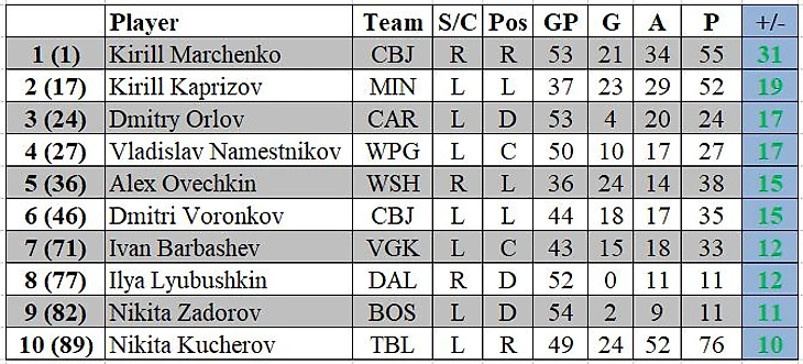 Худшие по показателю полезности среди россиян: Евегний Малкин «-19» (47 матчей, среднее игровое время 18:03); Матвей Мичков «-14» (52 матча, среднее время на льду 15:57); Егор Замула «-10» (39 матчей, среднее время на льду 16:52); Михаил Сергачев «-10» (47 матчей, среднее игровое время 25:45).