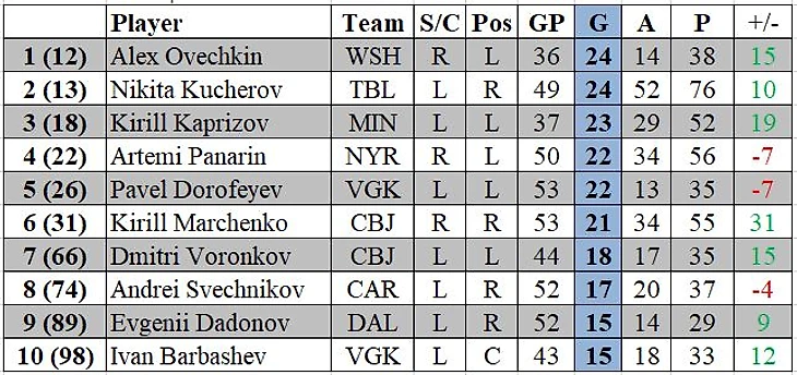 Кирилл Капризов («Миннесота»), Артемий Панарин («Нью-Йорк Рейнджерс»), Александр Овечкин («Вашингтон»), Павел Дорофеев («Вегас») и Кирилл Марченко («Коламбус») являются лучшими снайперами своих команд.