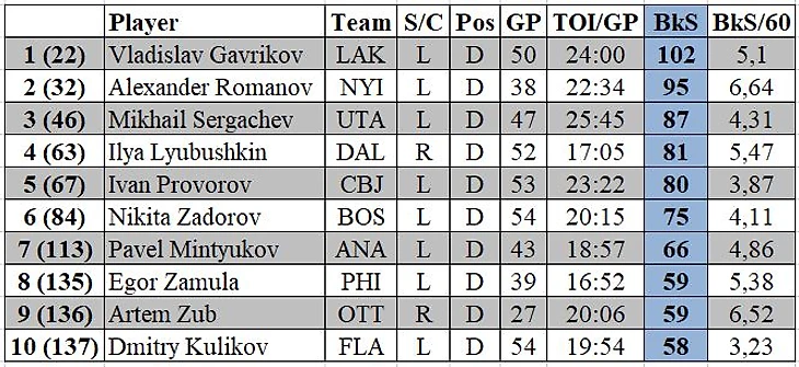 Пятерка лучших во всей лиге выглядит следующим образом: 1) Иэн Коул («Юта») 143 заблокированных броска в 52 матчах; 2) Джейкоб Труба («Анахайм», «Рейнджерс») 142 в 51; 3) Крис Танев («Торонто») 137 в 51; 4) Радко Гудас («Анахайм») 123 в 52; 5) Расмус Андерссон («Калгари») 123 в 52.