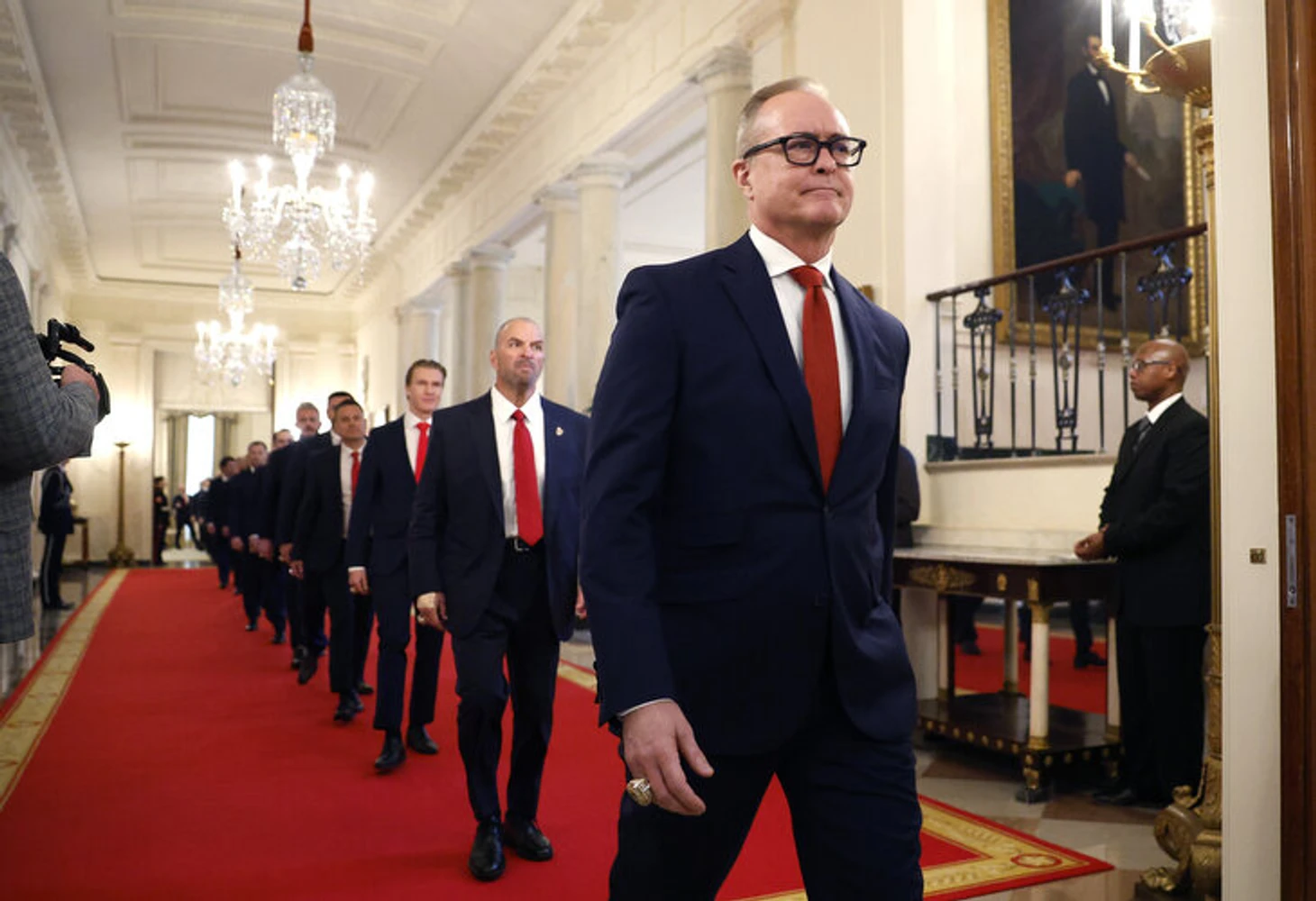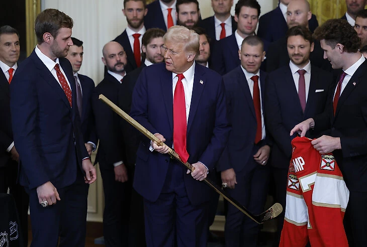 С Винсентом «Винни» Виолой – которому, к слову, он предлагал стать министром армии в прошлый президентский срок – Трамп лично увиделся накануне. Как и полагается при чемпионстве американской команды (то есть уже больше 30 лет подряд), спустя несколько месяцев после титула она всем составом – от владельца до пресс-службы – встречается с президентом страны (хотя победи в финале-2024 «Эдмонтон» – премьер-министр Канады Джастин Трюдо наверняка принял бы их на следующий день, если не в тот же вечер).