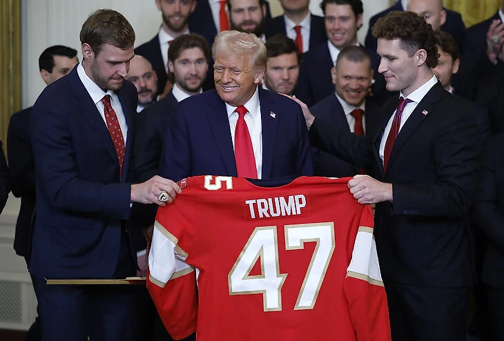 Разумеется, к таким людям приходят с трофеем. И с подарками – в гости идут все же. Игроки «Флориды» вручили Трампу именное джерси «45-47» (порядковые номера его президентства в истории страны) в специальной рамке, чтобы повесить на стену, а также свитер с 47-м номером – но уже как элемент гардероба.