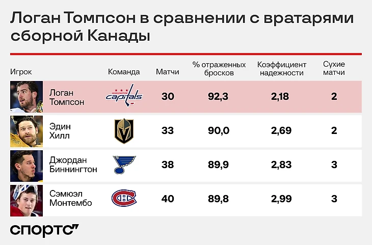 Интересно, что на предстоящий Турнир четырех наций Томпсона не взяли, хотя его статистика не идет ни в какое сравнение с тремя вратарями сборной – Логан на другом уровне.