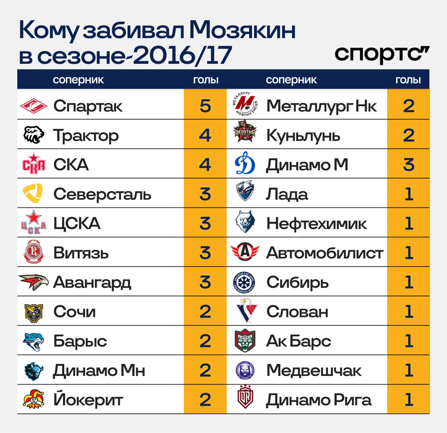 Важно, что Мозякин стабильно забивал разным соперникам. В воротах 22 из 29 клубов побывали шайбы Сергея. При этом у него нет выраженного любимого противника. Немногим выделяется только «Трактор», которому Мозякин забил 5 голов.