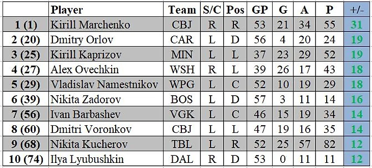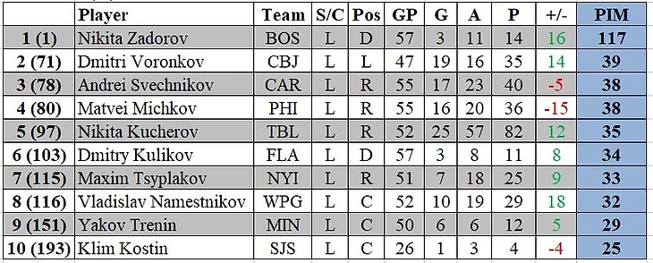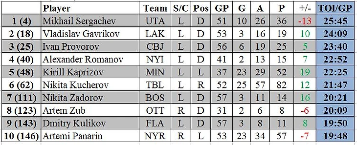 Худшие по показателю полезности среди россиян: Евегний Малкин «-19» (47 матчей, среднее игровое время 18:03); Матвей Мичков «-15» (55 матчей, среднее время на льду 16:03); Михаил Сергачев «-13» (51 матч, среднее игровое время 25:45); Егор Замула «-10» (39 матчей, среднее время на льду 16:52).