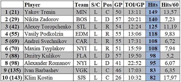 Яков Тренин за последние 2 недели сделал 24 силовых приема и упрочил лидерство среди наших хоккеистов, теперь в активе Тренина 149 силовых приемов в 50 матчах. На втором месте идет Никита Задоров (140 хитов в 57 матчах). Третьим идет Алексей Торопченко (125 силовых в 54 матчах).