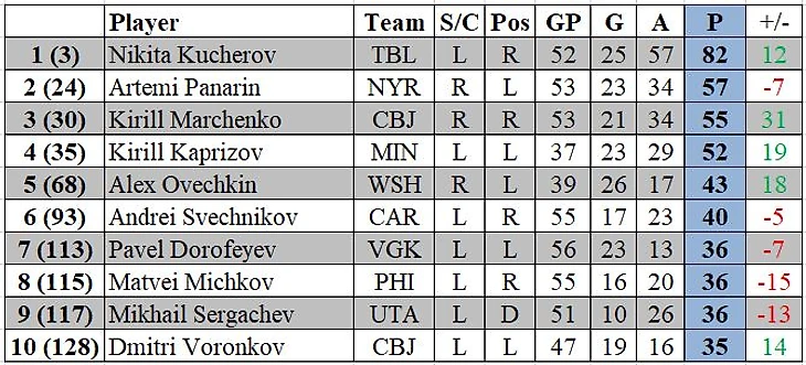 Никита Кучеров уверенно лидирует среди наших по набранным очкам, у Кучерова 82 (25+57) очка в 52 матчах. В борьбе за Арт Росс Трофи он пока уступает лишь двум форвардам: 1) Нэйтан Маккиннон («Колорадо Эвеланш») 87 (21+66) очков в 57 матчах; 2) Леон Драйзайтль («Эдмонтон Ойлерз») 83 (40+43) очка в 55 матчах.