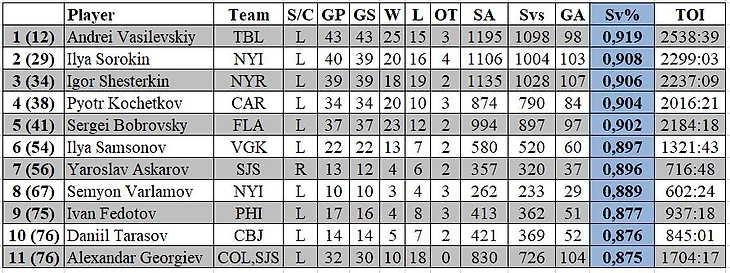 По проценту отраженных бросков лидерство удерживает Андрей Василевский, у которого 91.9 % отраженных бросков в 43 матчах. Вторым идет Илья Сорокин (90.8%), третьим Игорь Шестеркин (90.6 %).