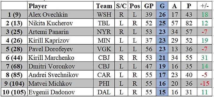 Александр Овечкин лидирует по заброшенным шайбам среди россиян, на его счету 26 голов в 39 матчах (0.67 гола за матч). Вторым идет Никита Кучеров (25 голов в 52 матчах). Третье место делят Артемий Панарин, Кирилл Капризов и Павел Дорофеев, у каждого из которых в активе 23 гола.