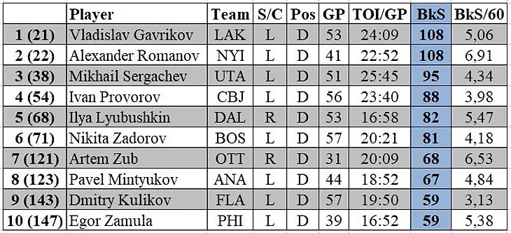 Пятерка лучших во всей лиге выглядит следующим образом: 1) Иэн Коул («Юта») 149 заблокированных бросков в 56 матчах; 2) Крис Танев («Торонто») 148 в 54; 3) Джейкоб Труба («Анахайм» / «Нью-Йорк Рейнджерс») 148 в 53; 4) Ник Силер («Филадельфия») 130 в 52; 5) Расмус Андерссон («Калгари») 129 в 55.