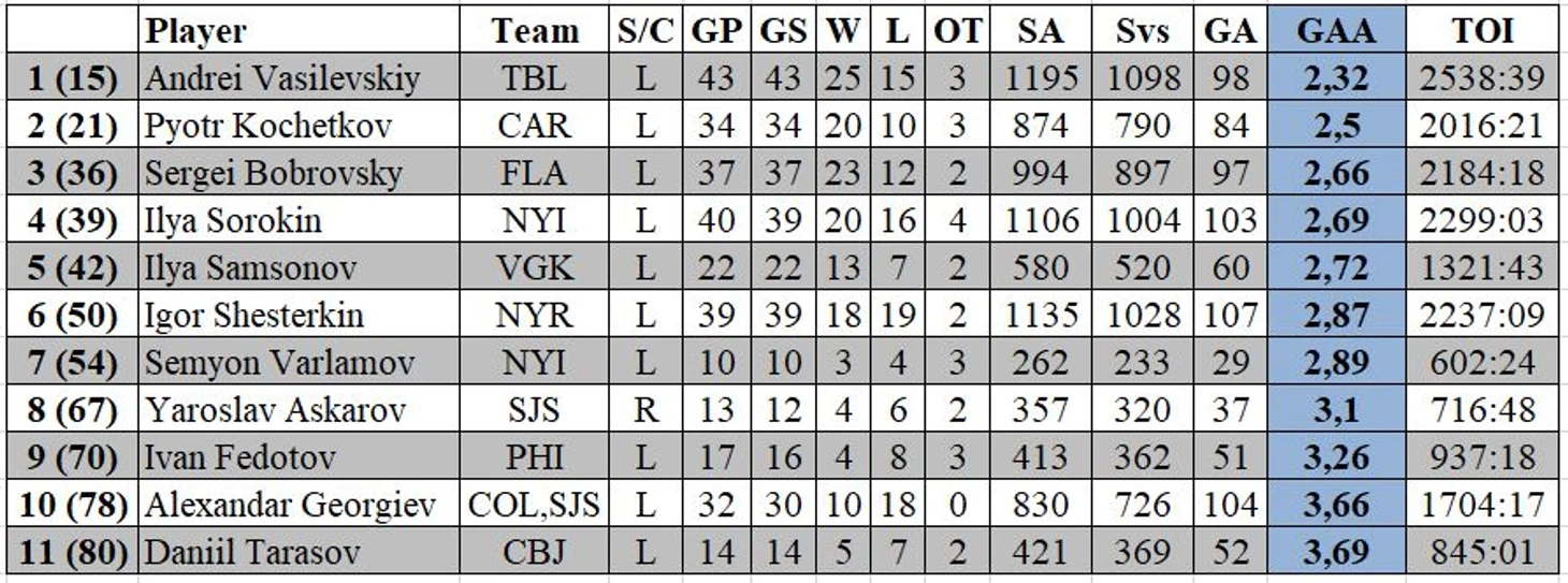 По коэффициенту надежности первое место среди наших вратарей также занимает Андрей Василевский с 2.32. Вторым идет Петр Кочетков с 2.50, третье место занимает Сергей Бобровский с 2.66.